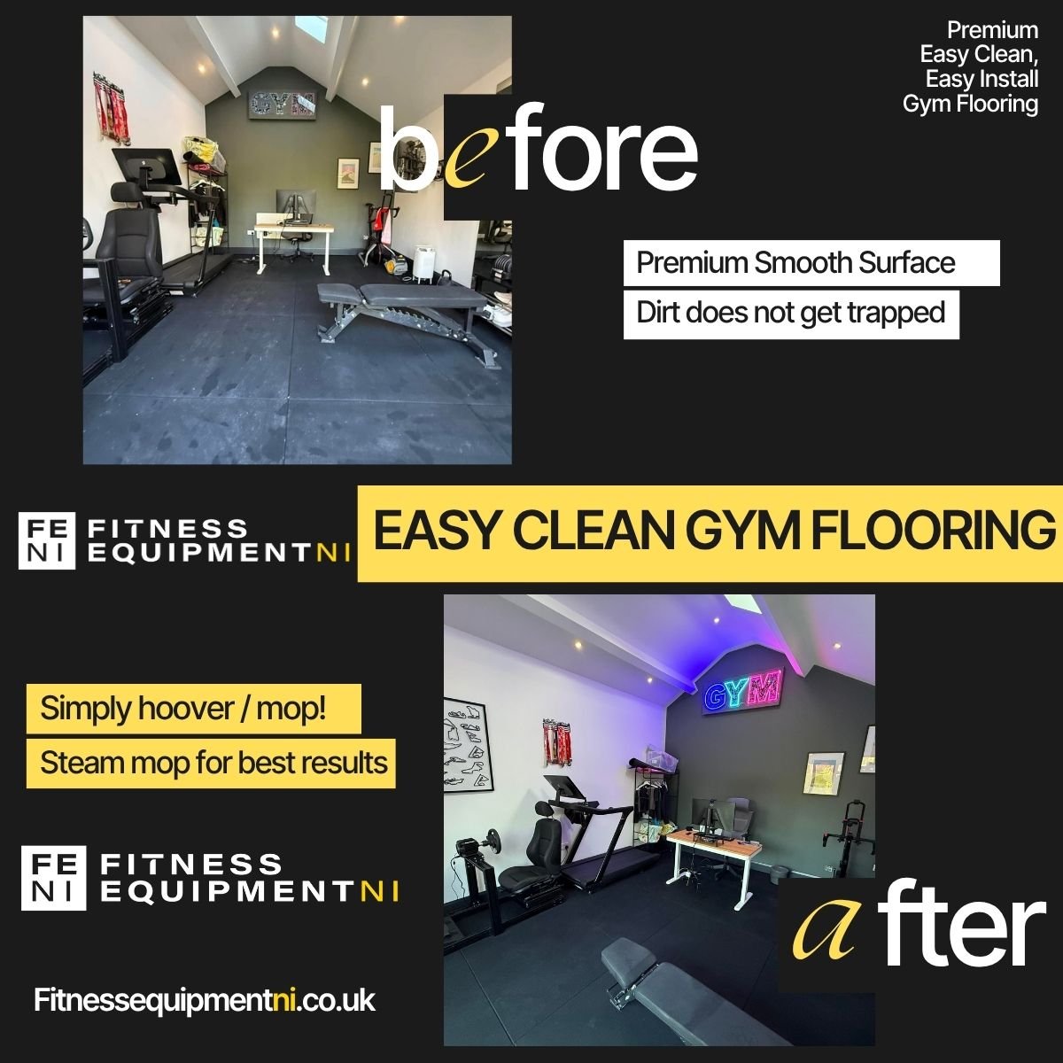 These tiles are made from a very fine SBR rubber granule which delivers a very premium top surface which does not trap the dirt compared to the open texture construction of traditional tiles. Any dirt just sits on top and can be hoover up. A quick mop / steam mop is all thats required to keep them looking in best condition. No time spent scrubbing to keep the gym looking great.